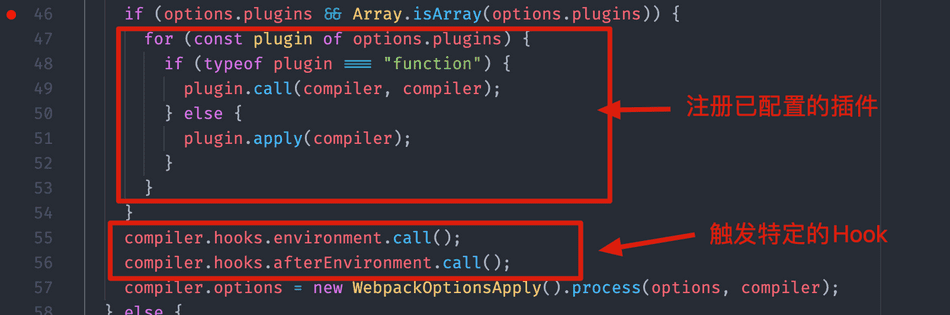 顺着主线接着往下看,如下图所示:在创建了 Compiler 对象过后,Webpack 在进入生命周期之前, 开始注册配置中的每一个插件,确保插件中的每一个钩子都能被命中。