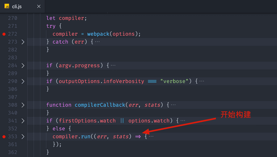 - 如果不是监视模式就调用 Compiler 对象的 run 方法,开始构建整个应用。