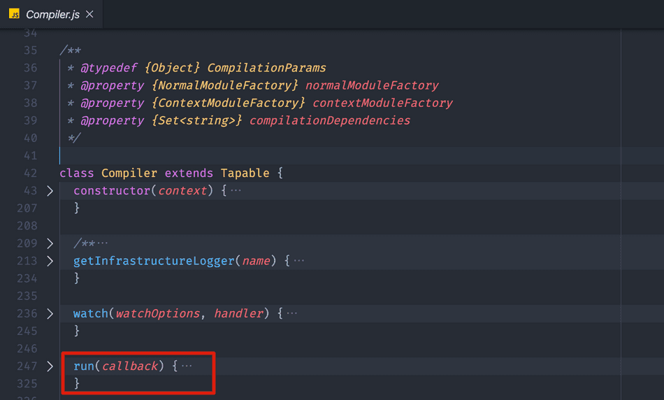 这个 run 方法定义在 Compiler 类型中,具体文件在 webpack 模块下的 lib/Compiler.js 中,代码位置如下: