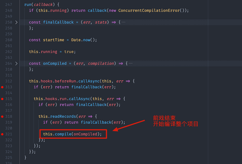 这个方法内部就是先触发了 beforeRun 和 run 两个钩子,然后调用了当前对象的 compile 方法,真正开始编译整个项目: