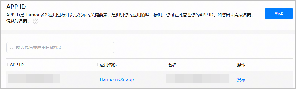 在“APP 与元服务 > HarmonyOS”页签,点击应用列表右侧“新建发布”,也可以为 APP ID 关联创建应用